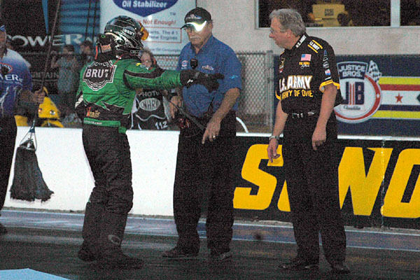 | Ron Capps disputes a call that kept him from running in the second session. |