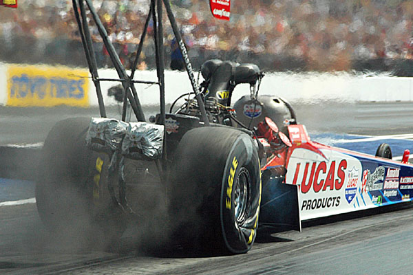 | Tony Schumacher does a smoky burn-out. |