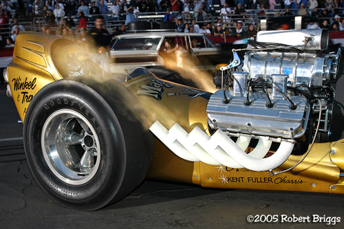 | Bill Pitts' Magicar AA/FD is an excellent example from the Golden Age of Drag Racing. Several front engine dragsters were on hand thrilling the crowd with the popular Cacklefest. |
