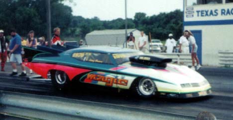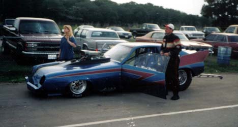 | Hugo's partner Conrad Ignasiak is in the Beretta . The ex Ash & Worden car has quickened the track with a 4.35 at 166. The "Trouble" of Junior Ibbert is in the far lane. This car has been driven by A.J. Rickrow to a 4.80, by Butch Lake to 4.50 at 156, and by Ronnie Rucker to low fives. |