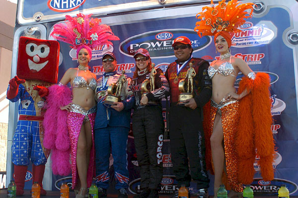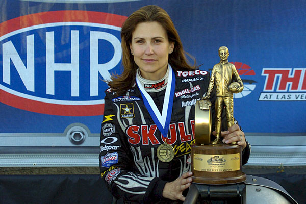 | A very happy Melanie Troxel poses with her dragster and her Wally. |