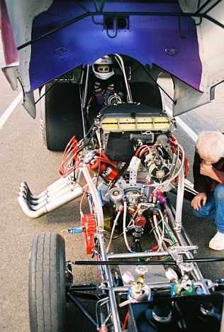 | In the staging lanes, Hosford in the hot seat and crewchief Bob Caldwell at right. Photo by Hapgood. |