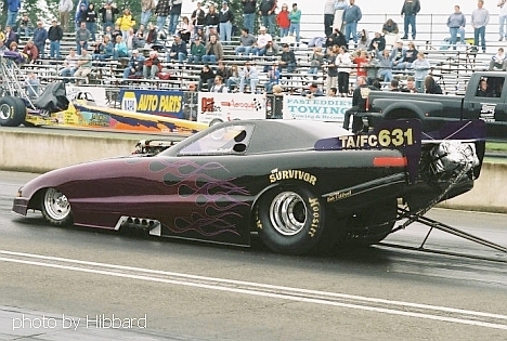 From the first outing of 2005, the car's performance improved, rapidly. In June Hosford ran a 6.15 part-track pass at Woodburn and then in July mounted his Fiat altered body on the chassis and ran a 6.05 which, according to the DRL files, ranks him as one of the top ten quickest AA/A drivers in the history of the sport. In August the team hit the road for Spokane to compete in the AHRA World Finals where Donn qualified the altered 3rd in TAFC with a 6.27 before a clutch malfunction spun the tires in the first round.