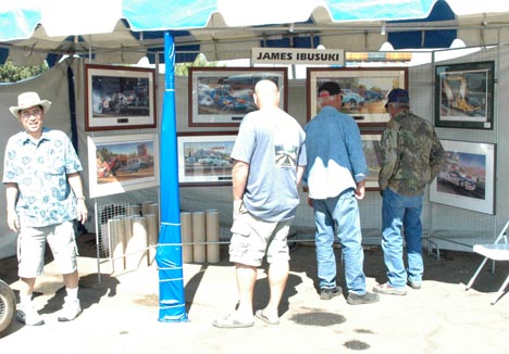 | Have you ever seen or met James Ibusuki. That's him on the far left getting ready to throw a rock at me for taking his picture. Hahaha - gotcha! Yes, those are copies of his paintings in the background. |