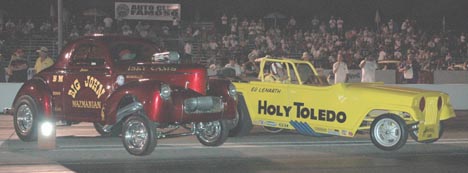| The actual first pair down for Cacklefest was a gasser and a funny car; the repop of Big John Mazmanian's Willys and Ed Lenarth's Jeep. With as much steam and liquids that poured out of Holy Toledo, Lenarth just about fried the iron 392! |