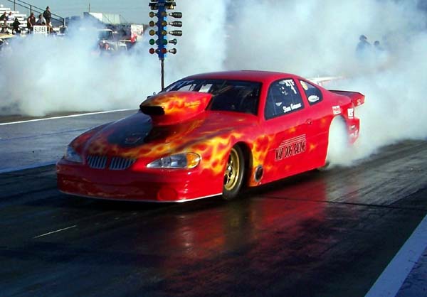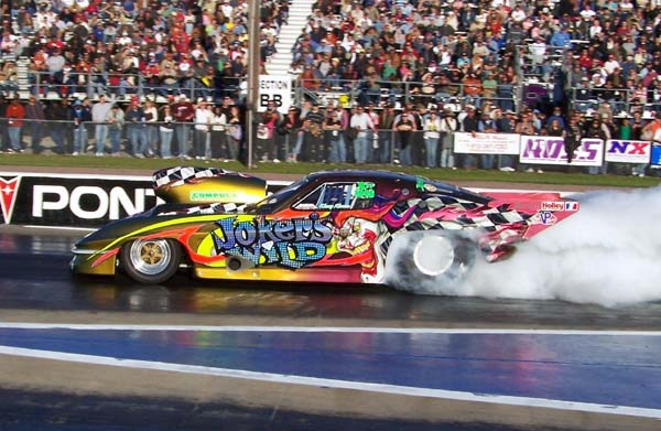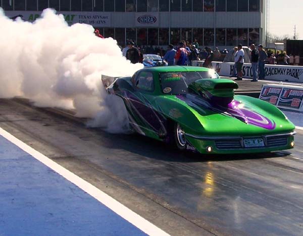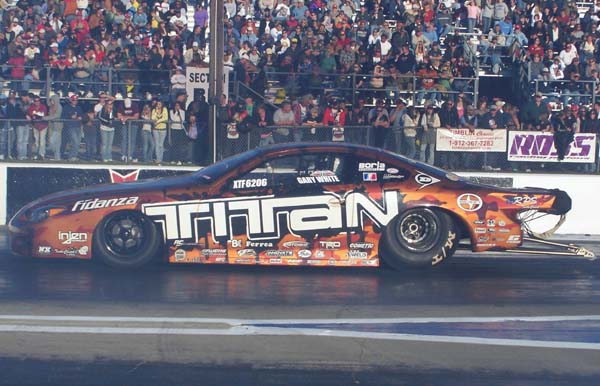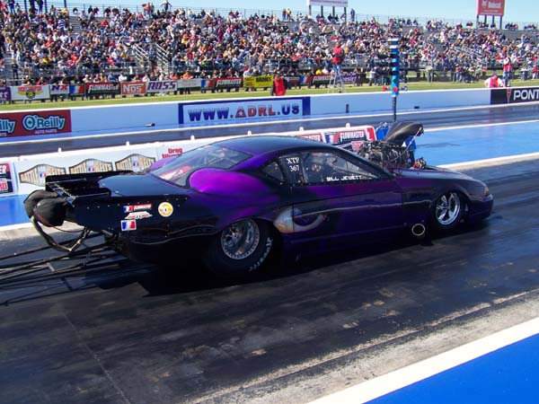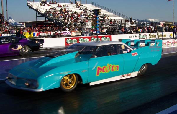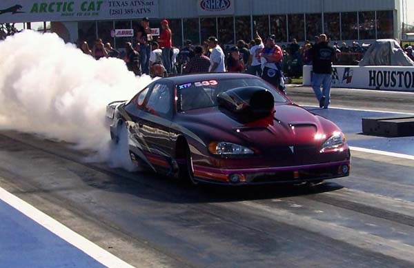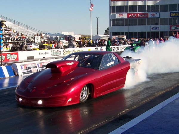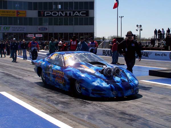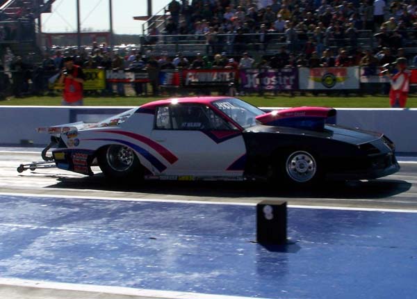 | Chassis builder David Janes made it to the finals at Baytown with his Grand Am. The beautiful ex Pro Stock car lost on a holeshot to Gorman in a race that featured side by side 4.411's! Janes ran a best of 4.385 171.03 in his homebuilt car. |
