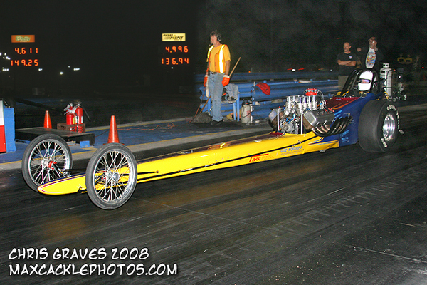 The dragsters got the evening started around 6:30 p.m. just ahead of the fuel altered’s first qualifying session in what was to be a spectacular night of nostalgic drag racing action in Texas. Rick Grindstaff rolled his beautiful "Quarterflash" machine to the line and clicked off a career best 4.98 at 138 mph with Johnny Laird along side at 5.47 at 125 mph. This was Grindstaff’s first sub five second lap and a great way to start off the last event of his rookie season with the series. Grindstaff has attended every event this year and will finish in the Smiley’s Top 5 no matter what happens here at Denton.