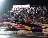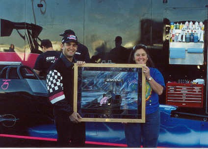 Laurie Watts presents Tony Schumacher with a stained glass picture of the Exide Top Fueler. Photo thanks to Laurie Watts