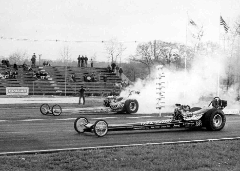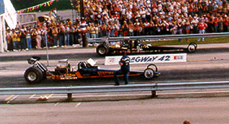 defeating kevin geiger. photo by rick howard.jpg) AHRA 1981 - The Alcohol Dragster final had Dan Nimmo (near lane) defeating Kevin Geiger. Photo by Rick Howard