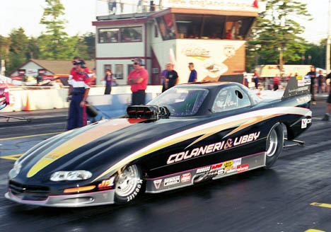 Jim Libby launches his awesome Camaro alky burner. He needs a wild name and tour to race on! Photo by James Morgan