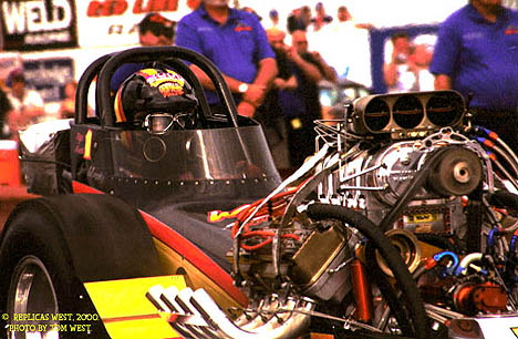 Jim Murphy's most recent vintage Top Fueler features a high windscreen that protects him from potential fires. Photo by Tom West