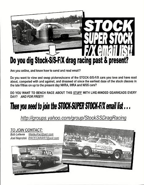 Joel Naprstek was promoting the Stock-Super Stock-FX Mailing List at Bruce Larson's USA-1 Dragfest. Flyer by Joel Naprstek