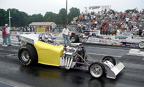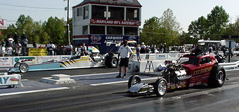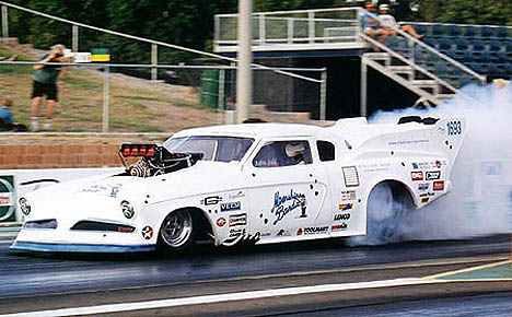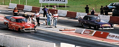 Nostalgia funny cars will be the only way to go in 2002. Here Jay's '57 takes on an immaculate '55 T-Bird. Photo thanks to Jay Mageau
