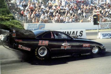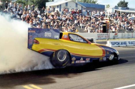 Ken Kraus set the alky funny car ranks on fire at Spokane. Photo by Nolan Hibbard