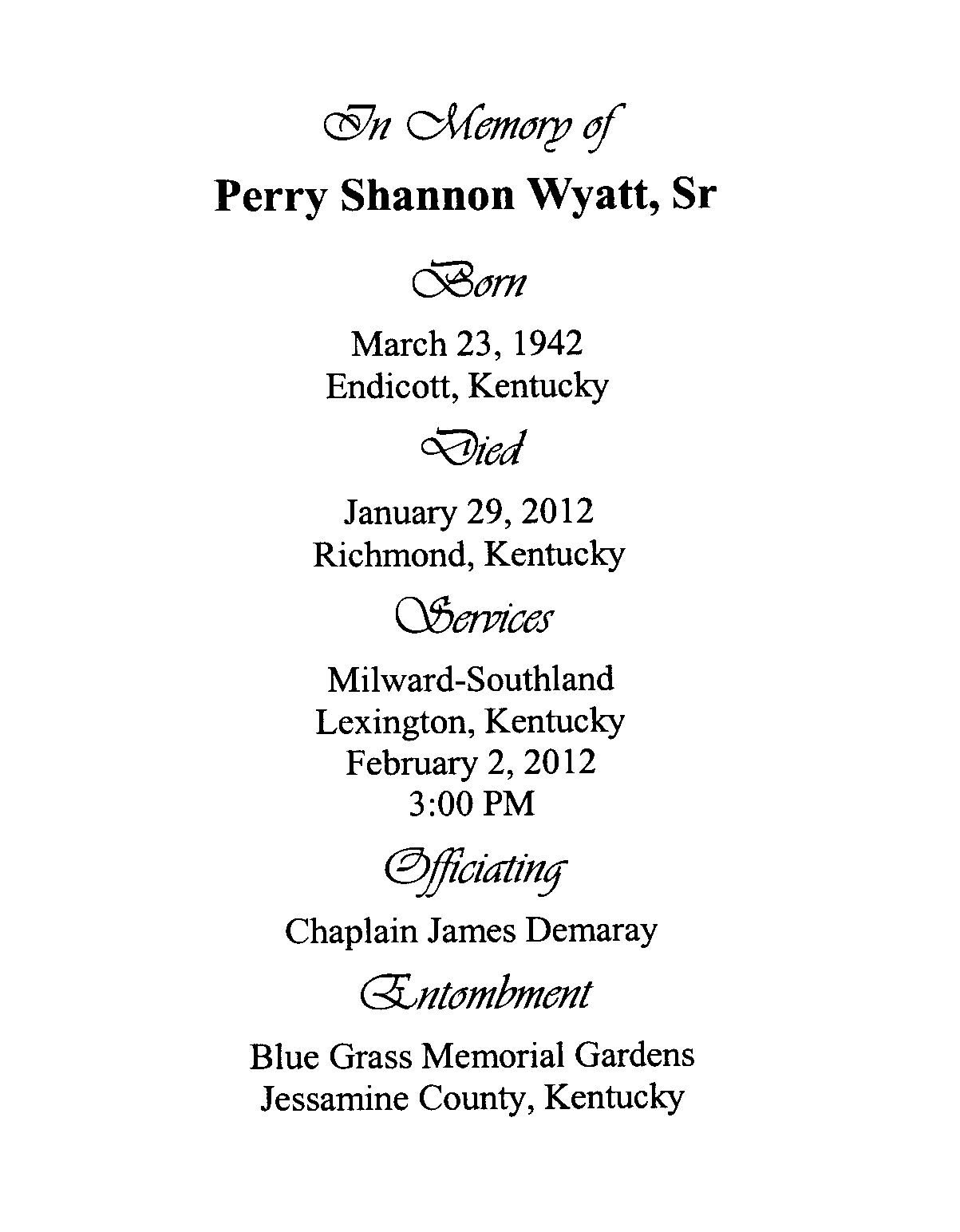 My Dad..Mr. "Super Camaro"....Perry Wyatt, has lost his long hard fought battle. He is the reason and foundation of ALL of the passion and drive that has lead me to where I am now !!!...........I Love You Forever dad and I take comfort in your being in a better place. GODSPEED DAD..............MAY YOU FOREVER REST IN PEACE.......March 23, 1942-January 29, 2012......