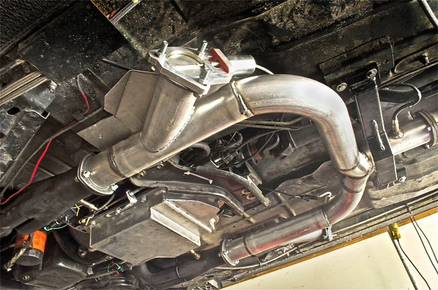Thanks BP. Got the headers installed, Y pipe fabricated. A couple turn downs on the cut outs & it's ready to roll. Jeff used the in-dash rear window defroster for the on/off switch. One of the no longer used A/C vents houses an LED screen to show the status of the servos. If he holds the switch on for 3 seconds control of the servos is transferred to the WOT switch on the injection. He can tweak it's operation with his laptop. Doesn't add any power, but it's an interesting set up, "computer geek fun". :mrgreen: