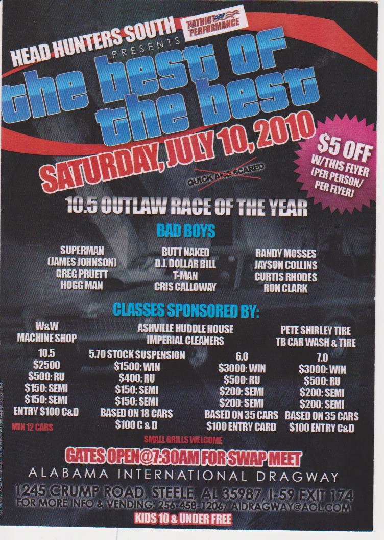 ALABAMA INTERNATIONAL DRAGWAY /PAYOUT FOR JULY 10,2010