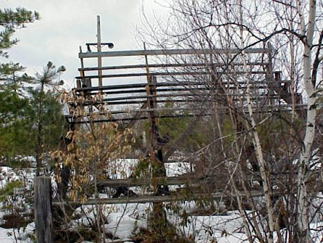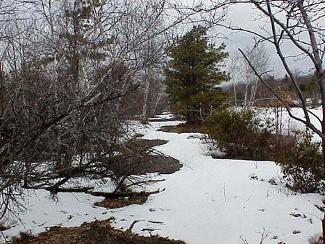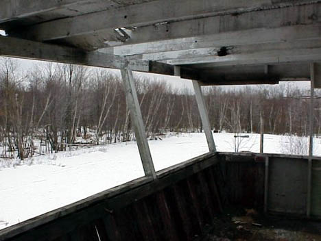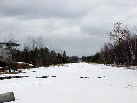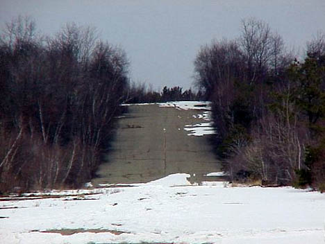 As I stood there looking at all the trees and bushes, my eyes caught sight of the end of a plank, with another just below and in front of it, and another above and behind it. The old wooden bleachers slowly took shape and appeared ghost-like, choked with brush and saplings, but bleachers none the less. I took a few more steps and suddenly there it was. A broad ribbon of pavement extending nearly half a mile from staging area to the end of the strip as it went up hill onto an outcropping of shale.