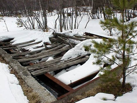 The road seemed to go on forever and disappeared into the brush and trees ahead of me as it meandered deeper and deeper into the woods. There were little signs here and there of something having been there long ago, but it could have been anything and after about 10 minutes of walking, I came upon what looked to be a small shanty, maybe a ticket booth, that had collapsed under the weight of it's roof and lay there in a heap of timber and shingle.
