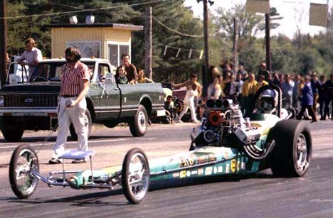 | Owner Jack Doyle keeps a watchful eye from the back as Roberts leaves the starting line the " Slider" AA/GD in 1968 action at New England Dragway. Low E.T. and top speed for the year was 7.64 at 195 mph. |