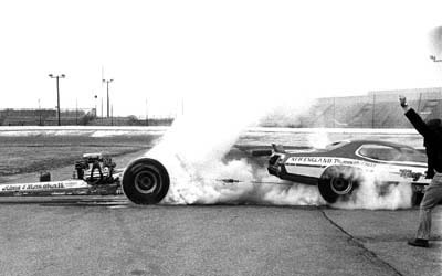 | Roberts takes his last ride down the quarter-mile at Epping on April 20, 1975 in the Jade Grenade. The ensuing accident and injuries sustained as a result ended a driving career that spanned nearly a decade. |