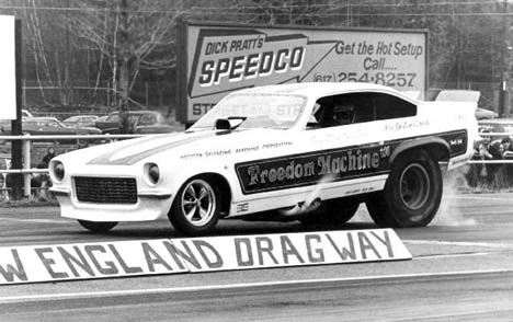 | Don teamed up with Charlie Siegars and John Corcoran on the new "Freedom Machine" Vega funny car for 1972. Powered by a Tom Dawes 392 hooked to a B & J Transmission, the car was a match race regular in the northeast. |
