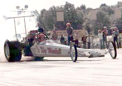 | King & Marshall put this Garlits chassis car together and it made its debut in August 1972. Nice car, ran easy 6.50's and won its share of races. Roberts said this was a fun car to drive and it opened up a whole new world with the motor behind you. |