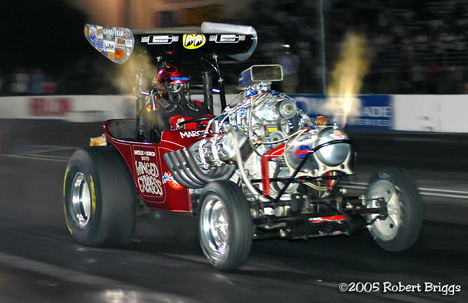 | Mike Boyd surpassed the 200 mph barrier for Pomona Saturday night on this pass in Hall of Famer Mousie Marcellus' famous Winged Express. Then he shattered that mark with a 205 mph pass to close the show on Sunday. |