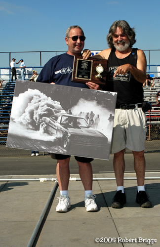 | Photographer Alan Earman (left) won the 2005 Leslie Lovett Memorial Photo Contest with his spectacular burnout photo taken at Carlsbad Raceway in the early 1970s. Dave Wallace Jr presented the award. |