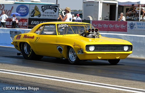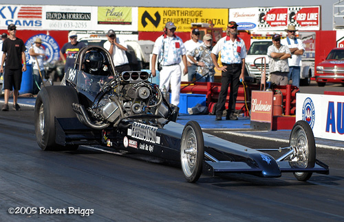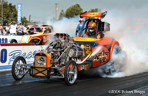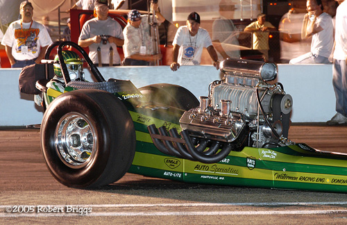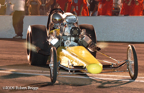 | Mike Kuhl's car with Carl Olson aboard showing off those long flames. |