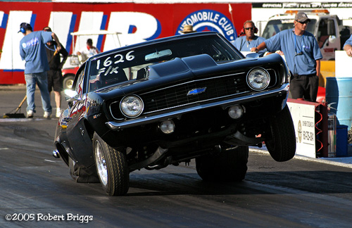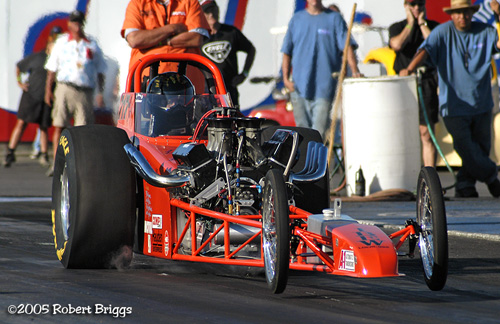 | Mike Boyd in the fabled Winged Express AA/FA thrilled the crowd with the wheels up at mid track. |