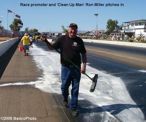 This just could have been the proverbial straw that did it to the camel. I mean everyone was starting to feel sorry for... and be damn glad they weren’t part of... the cleanup crew. Too bad they weren’t getting paid by the mile like the big riggers. Matter of fact, the clean up situation had gotten so bad that I actually saw one of the promoters of this deal, out on the track... pushing a broom!