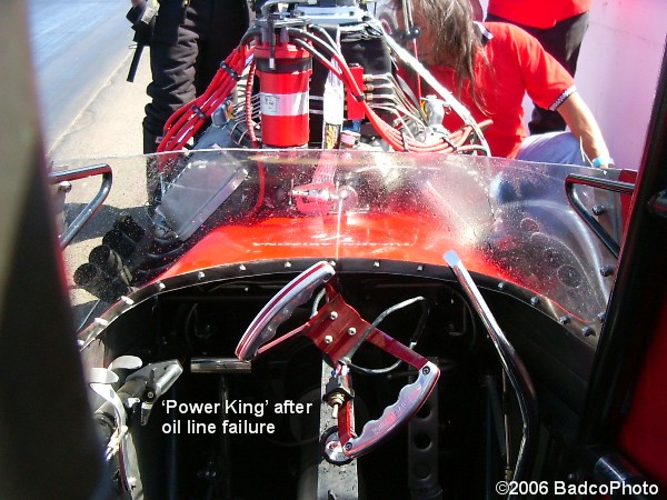 I arrived track-side just in time to watch the Patrick & Ferry ‘Power King’ Nostalgia Top Fuel Car do an impressive burnout... with an equally impressive orangish/yellow cloud following it down track. As soon as it stopped, driver Dan Rusk had it shut off and pulled over to the side of the track. How weird is this? It broke an oil line. Ya know... If it wasn’t for bad luck... the folks here at Speedworld... wouldn’t have no luck at all! The Power King seemed to be fine, except for a liberal amount of oil applied to the body (see image at top of story), no engine damage reported thanks to Dan’s quick thinking. But the track surface? Looks like the clean-up crew is back to square one... or Plan ‘B’.