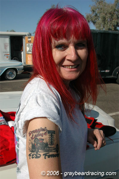 I had to ask her if she was related to the legendary Ed ‘Big Daddy’ Roth. "Like no." she told me, but he was the inspiration for both her strikingly different appearance and the lettering by ’Geet’ (Steve Faulkner) on the digger. Hey, check out those Tattoos. I know another Arizona lady that has an FED proudly tattooed on her. You suppose it’s the clime?