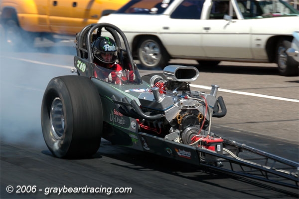 Hey, think I hear some cars doing burnouts over at the starting line. Let’s wander over that way and take a look. But wait... more NITRO thunder. The Power King (there’s a name with some history) team from Tucson have fired up their world’s fastest and quickest 354" ... not 392"... cast iron Hemi powered Nostalgia T/F car. Drew a pretty big crowd in a short while they did. When all of the excitement ended I resumed my trek to the starting line.