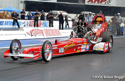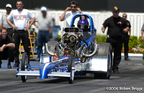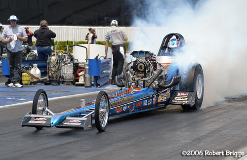 | Top Fuel Brendan Murry in his beautiful full bodied rail qualified 13th with a 6.054 sec 240.29 mph run. Brendan lost a tough Round One race to Jason Richey. |