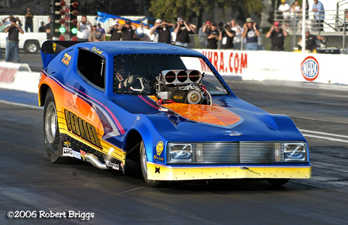 | Kin Bates set a new A/Fuel low E.T. record at 6.219 sec and then won the event against teammate Claude Lavoie when Claude couldn't find reverse after the burnout. |