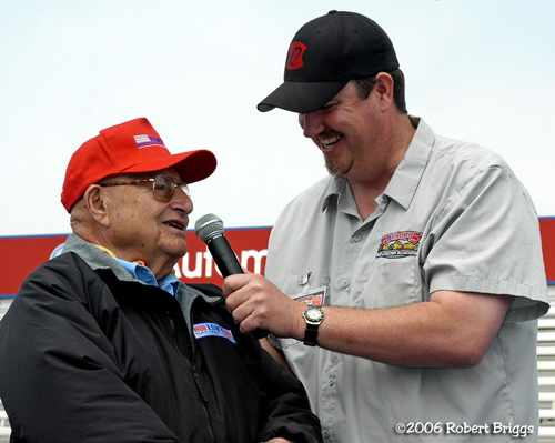 | Ed Iskenderian was honored by Goodguys for his legendary cams and support of drag racing. Goodguy's John Drummond and Ed "Isky" prior to the beginning of Eliminations on Sunday. |