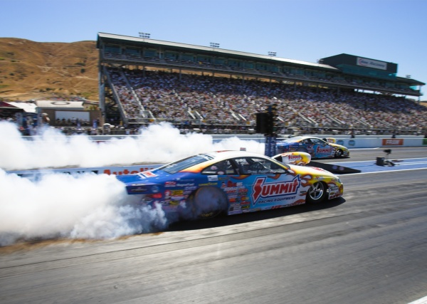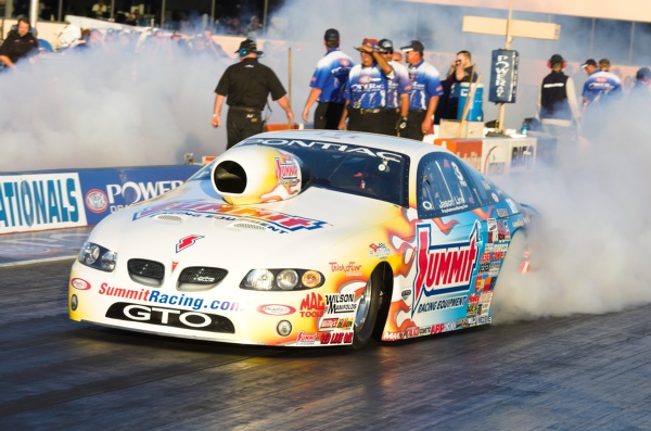 Greg Anderson and Jason Line in side-by-side burnouts during qualifying on Saturday. Jason Line took the #2 qualifying spot and the event win on Sunday in the final against V. Gaines.