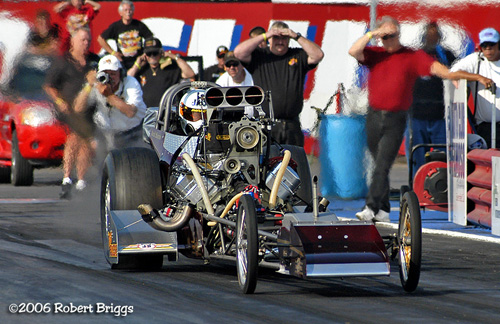 | With son Brett drivng the family's Nitro Thunder car Jack "The Sheriff" Harris saddled up with the Rodeck Team for the California Hot Rod Reunion. |