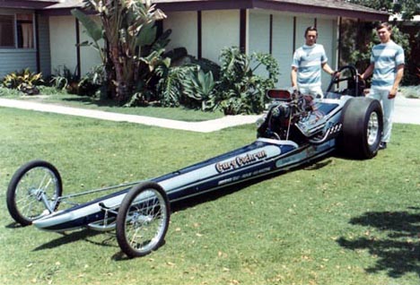 1965-66... Gary commissioned Ray Standoff of Bellflower Automotive Center to build him a new 23T roadster. The car began its early outings with an injected 390 Ford power plant on fuel that clicked off times of 8.40 at 174 mph. Enter engine builder Howard Rapp and a blown 427 Ford cross-bolt motor. Again burning fuel, "Mr. C" soon was running E.T.s of 8.14 and his speeds climbed to 189 mph. As he put it, "Now I was hooked on blown engines."