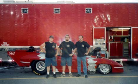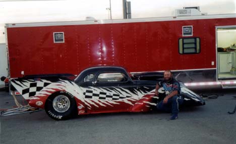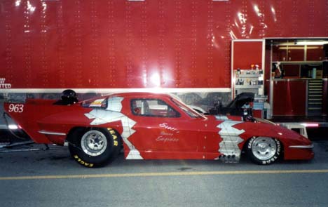 | Wes Johnston standing next to his BAE powered 53 Corvette. Johnston's best times are 4.28 at 142 on an early chute pass. |