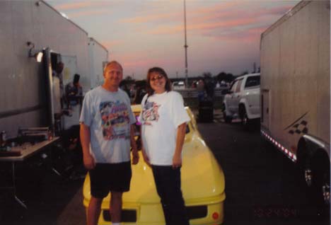 | Frankie "Mad Man" Taylor and my lovely wife Gena White in front of his former race car. Before the yellow Corvette met its desmise at Baytown, it ran 3.99 at 185 at the Dragstock race last year. |