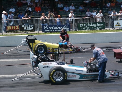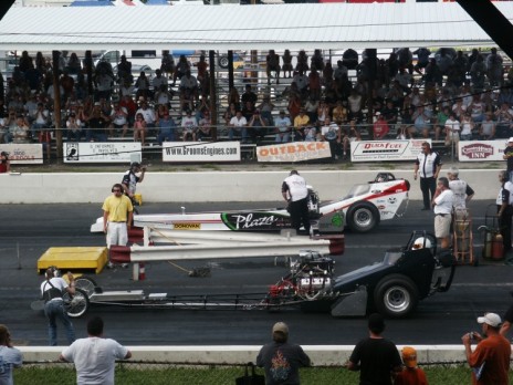 | Sean Bellemeur in The Plaza entry was matched up with Mark Worden for this qualifying run in Top Fuel. |