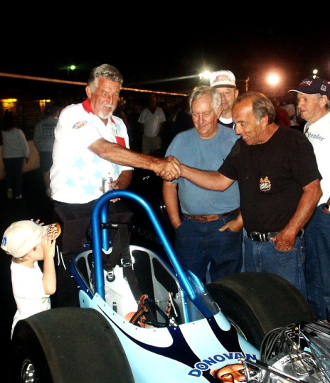 | Steve Gibbs congratulates Steve Carbone as Bob Creitz and a young fan look on. |