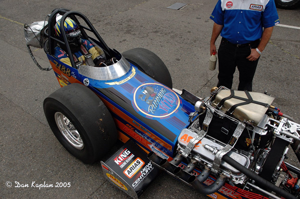 Brendan Murry's "Running Wild" Chevy AA/Fuel Dragster makes tracks for the finsh line at the recent Seattle Goodguys race.