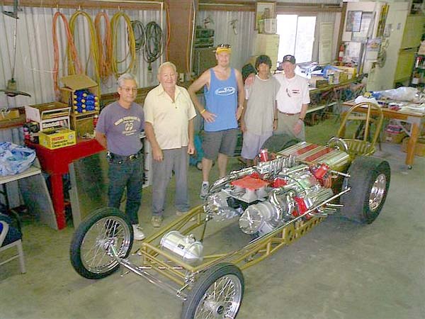 These are a couple pictures of our TWO THING dragster! This is an identical reproduction of the car we built in 1961. We lost track of the original car after we sold it. The only original part is the steering wheel (which we used on all our own cars). You can’t imagine the trouble we had locating the parts. For your info, both engines are 350 Chevys, side by side canted together, and meshed at the flywheel ring gears. The right engine rotates normally and the left engine rotates backwards. The clutch and drive line runs off the right engine. THINK ABOUT IT! There were 150 other things to take care of in the first time around. The only thing the car will be used for is the Cackle Fest at the reunion, maybe the Winters Cacklefest, and then the NHRA museum.