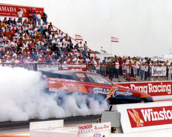 Kirk Johnson of Dallas, Texas, has raced alcohol funny cars since 1992. The "Texas Connection" was a long distance partnership between two states. The low-buck team formed as a little brother to the "Time Machine" TA/FC of the Stidham Bros. Kirk Johnson’s father, Hap Johnson, was the Stidham’s partner. Hap was a longtime competitor who had raced altereds, funny cars, and dragsters. Kirk took his first funny car ride at the Frank Hawley's drag racing school. The car that became the first "Texas Connection" was the car in which Jackie Stidham ran one of the first five-second times in a TA/FC in 1989.