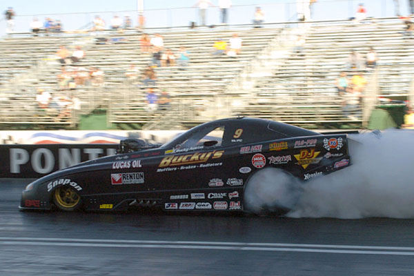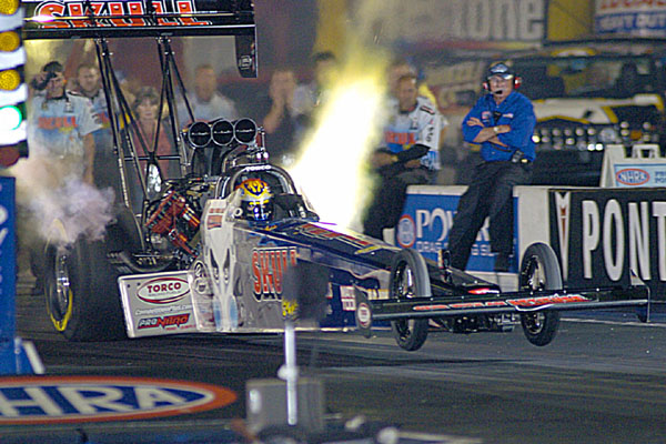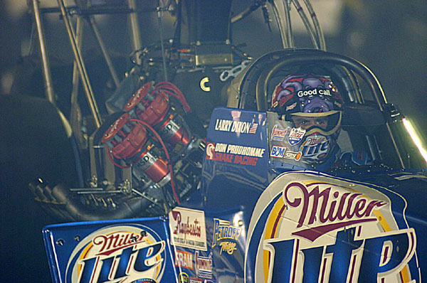 | Larry Dixon is boiling the hides on the Miller Lite dragster. |