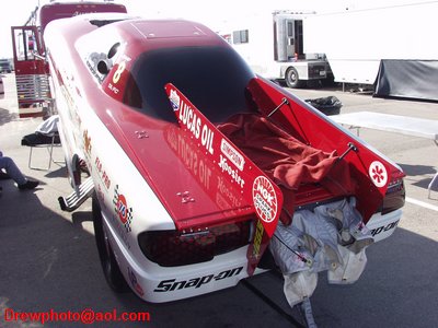 | There were all kinds of new ideas in this car out of Brad's shop, but the tech guys did not like the rear wings on the back of Buckys Pontiac funny car. |